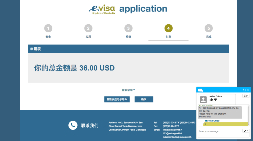 準備刷卡付簽證費了!目前台灣入境柬埔寨的簽證費為 36 美元,我覺得在東南亞中算是便宜的了(淚)。如果申請柬埔寨簽證有遇到問題無法解決的話,視窗右下角會有線上客服可以問,回覆速度非常快速,可以即時幫忙回答問題。