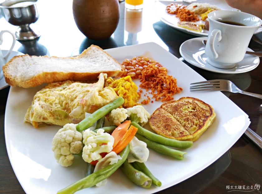 西式的現做早餐有歐姆蛋、培根、熱狗、一點點蔬菜切片還有超多烤吐司,歐姆蛋可以請主廚改做成炒蛋或荷包蛋等;飲料有咖啡或紅茶可以選,另外也有果汁可以點。斯里蘭卡的果汁都偏甜(其實我覺得多數熱帶國家的果汁都偏甜),如果不想喝這麼甜的話,在點餐的時候一定要告訴服務員 “No sugar.” 哦!